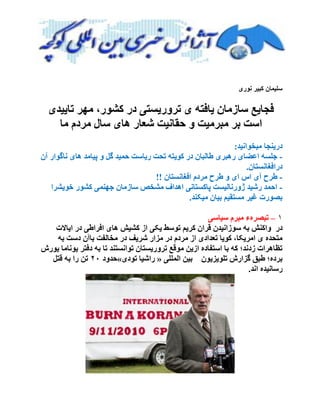 ثَ اتفبق آسا صولَ ثَ همش عبصهبى هلل هتضذ دس هضاس ؽشیف سا ثَ ؽذت هضکْم کشدًذ. ؽْسای اهٌیت دس سّص روؼَ (اّل اپشیل) اص دّلت افغبًغتبى خْاعت کَ ػبهالى ایي رٌبیبت سا هْسد پیگشد لشاس دُذ ّ اهٌیت کبسکٌبى عبصهبى هلل هتضذ دس افغبًغتبى سا تبهیي کٌذ. دس صبلی کَ ػول ایي کؾیؼ افشاؼی دس اهشیکب رذا” لبثل تمجیش هیجبؽذ، سّصبًیْى، ؽْساُبی ػلوب!!!؟؟؟ ّ هالُبی هفتخْاس ثَ تمجیش اػوبل ظذ اعالهی ؼبلجبى کَ دٍ ُب هکتت سا عْختبًذٍ اًذ ّ دس آًِب صذ ُب رلذ اص لشآى ػظین الؾبى ًیض ثَ آتؼ عْختَ اعت، ثبیغت ّاکٌؼ تٌذ تش ًؾبى دٌُذ؛ دس صبلی کَ ُویؾَ ثب ّلْع چٌیي صْادت اعفٌبک ثَ ًظبسٍ ًؾغتَ اًذ ّ عکْت ًوْدٍ اًذ. گفتٌیغت کَ هبٍ گزؽتَ( ثتبسیخ ۶ هبسچ ) دس عبیت ُوبیْى، ثشای پیؾگیشی اص ّلْع چٌیي صْادث تجصشٍ ی تضت ػٌْاى “ًیشًگ صسًگ، ؼبلجبى دس ؽِش ُبی افغبًغتبى تظبُشات سا ساٍ اًذاصی هیکٌٌذ( ثَ دعتْس رٌشال صویذ گل)” اًتؾبس یبفتَ ثْد کَ ُْؽذاسی ثْد ثشای دّلتوشداى ّ ًیشُّبی اهٌیتی افغبًغتبى، الصم داًغتَ خْاُذ ؽذ تب ثب هشّسی هزذد ثش ایي تجصشٍ ، ثبیغت دیگش ثشای عبصهبى هلل ّ رِبًیبى، ؽک ،