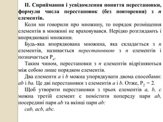 Число перестановок з n елементів дорівнює добутку всіх натуральних чисел від 1 до п, тобто п! (читають: єн факторіалів).