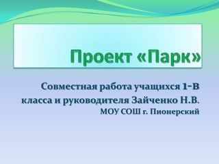 Проект «Парк» представляет собой совместную работу учащихся 1-в класса и их руководителя, целью которой является формирование навыка творческой работы и развитие способности самостоятельных исследований. Учащиеся мечтают о создании красивого детского парка в своем городе, вдохновляясь такими местами, как Диснейленд, и предлагают различные элементы для улучшения городской среды. Итогом проекта является активная команда, готовая продолжать работу в будущем и желание создать лучший парк для жителей и гостей города.