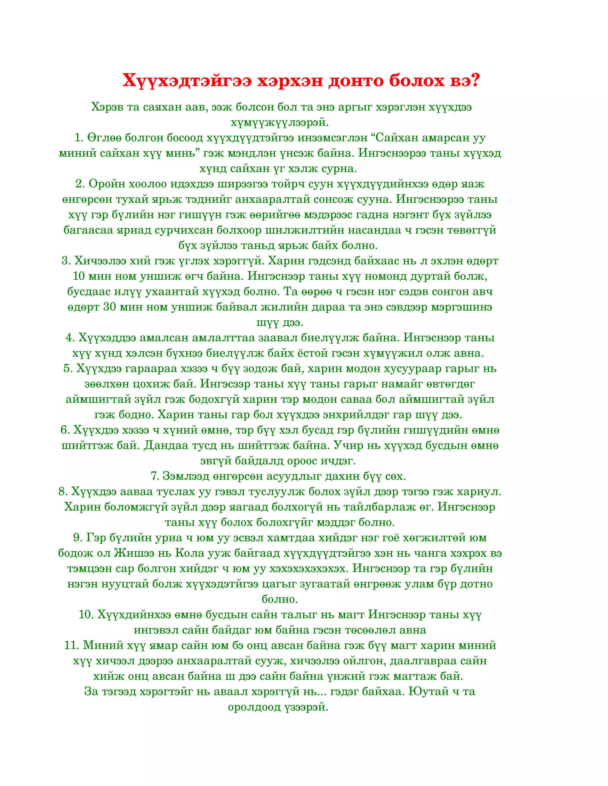 Хэрэв та саяхан аав, ээж болсон бол та энэ аргыг хэрэглэн хүүхдээ хүмүүжүүлээрэй. 1. Өглөө болгон босоод хүүхдүүдтэйгээ инээмсэглэн “Сайхан амарсан уу миний сайхан хүү минь” гэж мэндлэн үнсэж байна. Ингэснээрээ таны хүүхэд хүнд сайхан үг хэлж сурна. 2. Оройн хоолоо идэхдээ ширээгээ тойрч суун хүүхдүүдийнхээ өдөр яаж өнгөрсөн тухай ярьж тэднийг анхааралтай сонсож сууна. Ингэснээрээ таны хүү гэр бүлийн нэг гишүүн гэж өөрийгөө мэдэрээс гадна нэгэнт бүх зүйлээ багаасаа яриад сурчихсан болхоор шилжилтийн насандаа ч гэсэн төвөггүй бүх зүйлээ таньд ярьж байх болно. 3. Хичээлээ хий гэж үглэх хэрэггүй. Харин гэдсэнд байхаас нь л эхлэн өдөрт 10 мин ном уншиж өгч байна. Ингэснээр таны хүү номонд дуртай болж, бусдаас илүү ухаантай хүүхэд болно. Та өөрөө ч гэсэн нэг сэдэв сонгон авч өдөрт 30 мин ном уншиж байвал жилийн дараа та энэ сэвдээр мэргэшинэ шүү дээ. 4. Хүүхэддээ амалсан амлалттаа заавал биелүүлж байна. Ингэснээр таны хүү хүнд хэлсэн бүхнээ биелүүлж байх ёстой гэсэн хүмүүжил олж авна. 5. Хүүхдээ гараараа хэзээ ч бүү зодож бай, харин модон хусуураар гарыг нь зөөлхөн цохиж бай. Ингэсээр таны хүү таны гарыг намайг өвтөгдөг аймшигтай зүйл гэж бодохгүй харин тэр модон саваа бол аймшигтай зүйл гэж бодно. Харин таны гар бол хүүхдээ энхрийлдэг гар шүү дээ. 6. Хүүхдээ хэзээ ч хүний өмнө, тэр бүү хэл бусад гэр бүлийн гишүүдийн өмнө шийтгэж бай. Дандаа тусд нь шийтгэж байна. Учир нь хүүхэд бусдын өмнө эвгүй байдалд ороос ичдэг. 7. Зэмлээд өнгөрсөн асуудлыг дахин бүү сөх. 8. Хүүхдээ ааваа туслах уу гэвэл туслуулж болох зүйл дээр тэгээ гэж хариул. Харин боломжгүй зүйл дээр яагаад болхогүй нь тайлбарлаж өг. Ингэснээр таны хүү болох болохгүйг мэддэг болно. 9. Гэр бүлийн уриа ч юм уу эсвэл хамтдаа хийдэг нэг гоё хөгжилтөй юм бодож ол Жишээ нь Кола ууж байгаад хүүхдүүдтэйгээ хэн нь чанга хэхрэх вэ тэмцээн сар болгон хийдэг ч юм уу хэхэхэхэхэхэх. Ингэснээр та гэр бүлийн нэгэн нууцтай болж хүүхэдэтйгээ цагыг зугаатай өнгрөөж улам бүр дотно болно. 10. Хүүхдийнхээ өмнө бусдын сайн талыг нь магт Ингэснээр таны хүү ингэвэл сайн байдаг юм байна гэсэн төсөөлөл авна 11. Миний хүү ямар сайн юм бэ онц авсан байна гэж бүү магт харин миний хүү хичээл дээрээ анхааралтай сууж, хичээлээ ойлгон, даалгавраа сайн хийж онц авсан байна ш дээ сайн байна үнжий гэж магтаж бай. За тэгээд хэрэгтэйг нь аваал хэрэггүй нь... гэдэг байхаа. Юутай ч та оролдоод үзээрэй.
