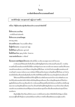 อยู่บู่ ม.6/7 เลขที่ 2 คาชี้แจง ให้ผู้เรียนแต่ละกลุ่มเขียนข้อเสนอโครงงานตามหัวข้อต่อไปนี้ ชื่อโครงงาน (ภาษาไทย) การขับขี่รถอย่างปลอดภัย ชื่อโครงงาน (ภาษาอังกฤษ) Driving safely ประเภทโครงงาน โครงงานเพื่อการศึกษา ชื่อผู้ทาโครงงาน นาย คุณานนต์ อยู่บู่ ชื่อที่ปรึกษา ครูเขื่อนทอง มูลวรรณ์ ชื่อที่ปรึกษาร่วม คุณครู นันทิตา รัตนธรรม ระยะเวลาดาเนินงาน1-3 สัปดาห์ ที่มาและความสาคัญของโครงงาน (อธิบายถึงที่มา แนวคิด และเหตุผล ของการทาโครงงาน) การขับรถยนต์ให้ปลอดภัย ถือเป็นเป้าหมายที่สาคัญที่สุดสาหรับการขับรถยนต์ในแต่ละครั้ง การเตรียม ความพร้อมทั้งรถยนต์และคนขับเป็นสิ่งที่มีความสาคัญอย่างมาก เพราะหากมีการตรวจสอบความพร้อมใช้งานของ รถยนต์ก่อนออกเดินทาง จะช่วยให้ลดการเกิดอุบัติเหตุได้ถึงร้อยละ 30 สาหรับในส่วนของผู้ขับรถยนต์เองหากมี การเตรียมตัววางแผนการเดินทาง และการพักผ่อนให้เพียงพอก็จะช่วยลดการเกิดอุบัติเหตุได้ถึงร้อยละ 40 ในส่วน ประเด็นที่เหลือจะเป็นเทคนิคเพิ่มเติมที่จะช่วยให้เราขับขี่ได้ปลอดภัยขึ้น ซึ่งเราจะมาเรียนรู้กันในประเด็นเหล่านี้ วิธีขับรถยนต์ให้ปลอดภัยเพื่อช่วยให้ท่านผู้ใช้รถประหยัดเงินทองและช่วยในการประหยัดพลังงาน และ ช่วยให้ท่านขับรถยนต์อย่างมีประสิทธิภาพไม่เกิดอุบัติเหตุบนท้องถนน ซึ่งการเกิดอุบัติเหตุแต่ละครั้งก็จะมีการ สูญเสียทั้งเงินทองหรืออาจจะเสียคนที่เรารัก การขับรถยนต์ที่ปลอดภัยนี้จะต้องไม่ประมาท มีสติในการขับขี่รถอยู่ เสมอ เพราะจะเกิดอุบัติเหตุขึ้นกับเราตอนไหน ก็ต่างยังไม่มีใครรู้ที่สาคัญเมือเกิดอาการเมาหรือง่วงไม่ควรที่จะขับ รถยนต์ควรจะนอนพักผ่อนก่อนจะดีที่สุดและก่อนออกเดินทางทุกครั้งควรที่จะเช็ครถยนต์ของท่านทุกครั้งก่อน ออกเดินทาง ปัจจุบันมีผู้คนใช่รถใช่ถนนเป็นจานวนมาก การขับขี่รถอย่างระมัดระวังจึงถึงเป็นสิ่งสาคัญมากๆทั้งต่อ ตนเองและผู้อื่นเพื่อให้อยู่ในความปลอดภัยจึงอยากจะศึกษาการขับขี่รถเพื่อผลดีต่อตนเองและผู้คนรอบข้าง