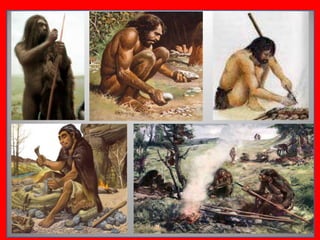 Документ содержит дополнительный иллюстративный материал по теме возникновения человека и первобытного общества, охватывающий уроки 1-8. Он рассматривает эволюцию человека, жилища и орудия труда первобытных людей, а также их основные занятия и первые религиозные представления. Также упоминаются изобретения неолитической революции и развитие ранней культуры.
