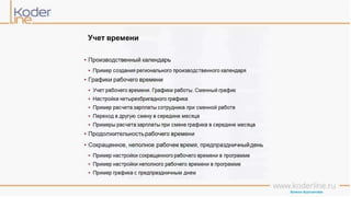 Данная презентация была показана в ходе вебинара «Учет рабочего времени в программе «1С:Зарплата и управление персоналом 8» ред. 3». Организатор - компания "Кодерлайн", http://www.koderline.ru/ Ведущая: специалист-консультант 1С Елена БУРХАНОВА .