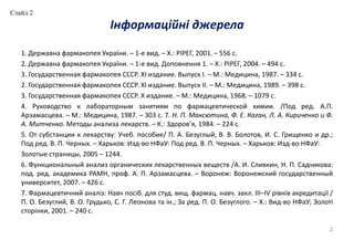 1. Державнафармакопея України. – 1-е вид. – Х.: РІРЕГ, 2001. – 556 с.