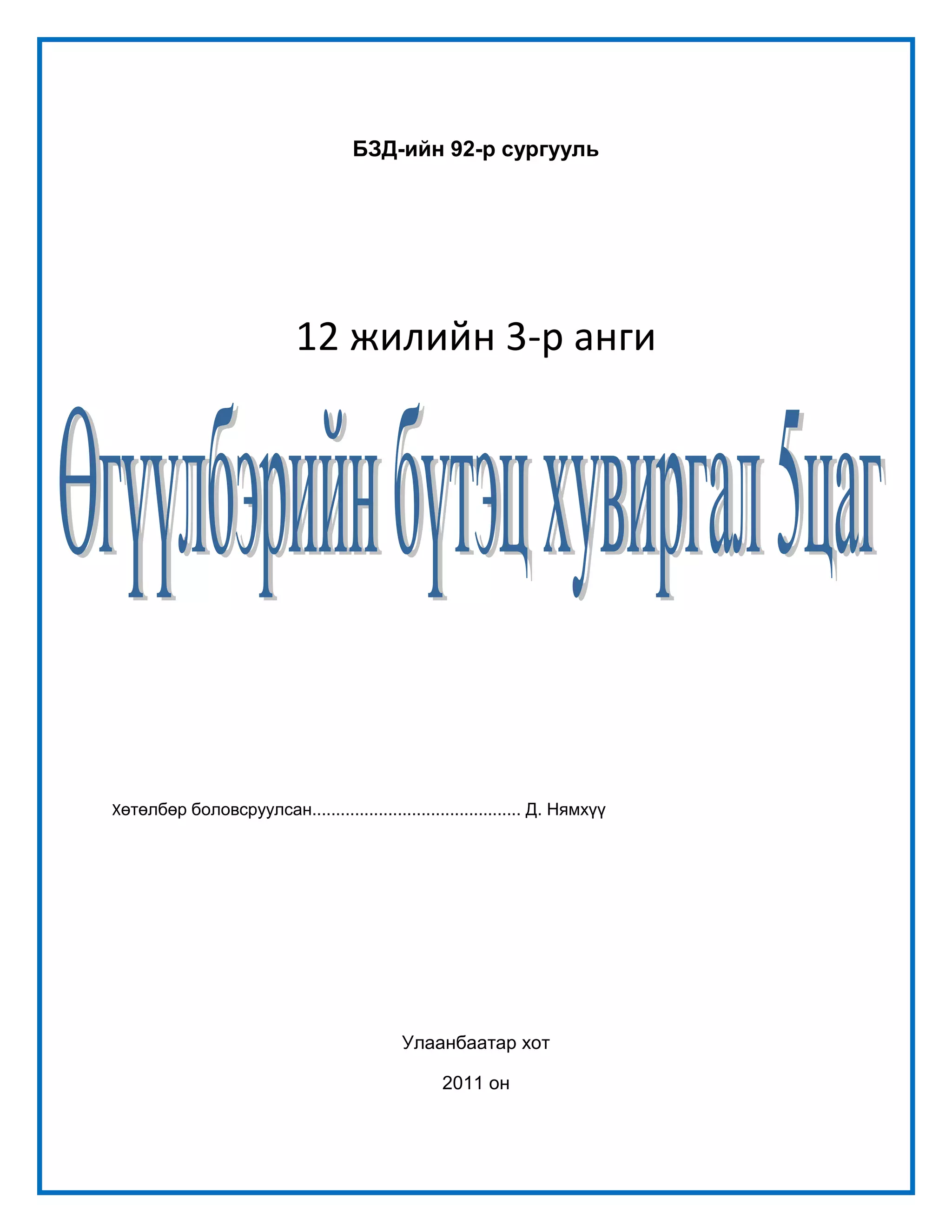 БЗД-ийн 92-р сургууль<br/>12 жилийн 3-р анги <br />Хөтөлбөр боловсруулсан............................................ Д. Нямхүү <br />Улаанбаатар хот<br />2011 он<br />БЗД-ийн 92-р сургууль<br />12 жилийн 3-р анги <br />Хөтөлбөр боловсруулсан............................................ Д. Нямхүү <br />Улаанбаатар хот<br />2011 он<br />БЗД-ийн 92-р сургууль<br />12 жилийн 3-р анги <br />Хөтөлбөр боловсруулсан............................................ Д. Нямхүү <br />Улаанбаатар хот<br />2011 он<br />