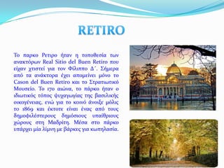 RETIROΤο παρκοΡετιρο ήτανη τοποθεσία των ανακτόρων RealSitiodelBuenRetiro που είχαν χτιστεί για τον Φίλιππο Δ΄. Σήμερα από τα ανάκτορα έχει απομείνει μόνο το CasondelBuenRetiro και το Στρατιωτικό Μουσείο. Το 17ο αιώνα, το πάρκο ήταν ο ιδιωτικός τόπος ψυχαγωγίας της βασιλικής οικογένειας, ενώ για το κοινό άνοιξε μόλις το 1869 και έκτοτε είναι ένας από τους δημοφιλέστερους δημόσιους υπαίθριους χώρους στη Μαδρίτη. Μέσα στο πάρκο υπάρχει μία λίμνη με βάρκες για κωπηλασία.