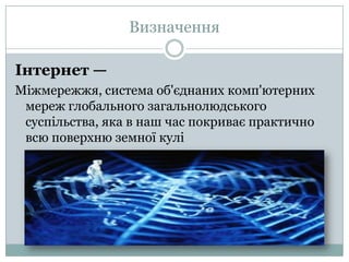 ВизначенняІнтернет —Міжмережжя, системаоб'єднанихкомп'ютерних мереж глобального загальнолюдськогосуспільства, яка в наш час покриває практично всю поверхнюземноїкулі