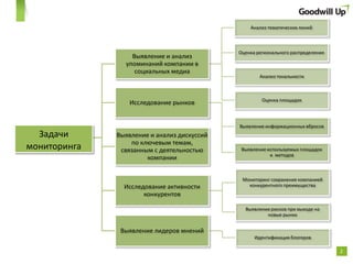 Документ описывает процесс мониторинга социальных медиа в Москве, включая задачи, технологии и площадки для мониторинга. Указаны источники информации, такие как социальные сети и блоги, а также цели анализа данных для формирования имиджа компании. В конце представлена контактная информация организации, занимающейся мониторингом.