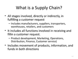 1. The document discusses supply chain management and defines a supply chain as all stages involved in fulfilling a customer request, including manufacturers, suppliers, transporters, warehouses, retailers, and customers.