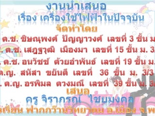 งานนำเสนอ 1 1. งานนำเสนอเรื่อง เครื่องใช้ไฟฟ้าในปัจจุบันจัดทำโดย 1. ด.ช. ชิษณุพงศ์ ปัญญาวงศ์ เลขที่ 3 ชั้น ม. 3/3 2. ด.ช. เสฎฐวุฒิ เมืองมา เลขที่ 15 ชั้น ม. 3/3 3. ด.ช. อนวัชช์ ด้วยอำพันธ์ เลขที่ 19 ชั้น ม. 3/34. ด.ญ. สหัสา ขยันดี เลขที่ 36 ชั้น ม. 3/3 5. ด.ญ. อรพิมล ดวงมณี เลขที่ 39 ชั้น ม. 3/3เสนอครู จิราภรณ์ ไชยมงคลโรงเรียน ฟากกว๊านวิทยาคม อ.เมือง จ.พะเยา 2. 3. 4. 5. 6. 2. เทอร์โมสตาร์ท หรือสวิตซ์ความร้อนอัตโนมัติ ทำหน้าที่ควบคุมอุณหภูมิไม่ให้ร้อนเกินไป มีส่วนประกอบเป็นโลหะต่างชนิดกัน 2 แผ่นมาประกบกัน เมื่อได้รับความร้อนจะขยายตัวได้ไม่เท่ากัน เช่น เหล็กกับทองเหลือง โดยให้แผ่นโลหะที่ขยายตัวได้น้อย(เหล็ก)อยู่ด้านบน ส่วนโลหะที่จะขยายตัวได้มาก(ทองเหลือง)อยู่ด้านล่าง เมื่อกระแสไฟฟ้าไหลผ่านแผ่นโลหะทั้งสองมากขึ้น จะทำให้มีอุณหภูมิสูงจนแผ่นโลหะทั้งสองซึ่งขยายตัวได้ต่างกันโลหะที่ขยายตัวได้มากจะขยายตัวโค้งงอ เป็นเหตุให้จุดสัมผัสแยกออกจากกัน เกิดเป็นวงจรเปิด กระแสไฟฟ้าจึงไหลผ่านไม่ได้ และเมื่อแผ่นโลหะทั้งสองเย็นลงก็จะสัมผัสกันเหมือนเดิม เกิดเป็นวงจรปิด กระแสไฟฟ้าจึงไหลผ่านได้อีกครั้งหนึ่ง 7. 3. แผ่นไมกา หรือ แผ่นใยหิน ซึ่งเป็นฉนวนไฟฟ้า ในเครื่องใช้ไฟฟ้าที่ให้พลังงาน ความร้อนบางชนิด เช่น เตารีด หม้อหุงข้าว เตาไฟฟ้า จะมีแผ่นไมกา หรือใยหิน เพื่อป้องกันไม่ให้ขดลวดหลอมละลาย และป้องกันไฟฟ้ารั่วขณะใช้งาน 8. 9. 2.เครื่องใช้ไฟฟ้าที่ให้พลังงานกล เครื่องใช้ไฟฟ้าที่ให้พลังงานกล มีการเปลี่ยนรูปพลังงานไฟฟ้าเป็นพลังงานกล โดยอาศัยหลักการเหนี่ยวนำแม่เหล็กไฟฟ้า ด้วยอุปกรณ์ ที่ เรียกว่า มอเตอร ์และ เครื่องควบคุมความเร็วซึ่งเป็นอุปกรณ์หลักในเครื่องใช้ไฟฟ้าที่ให้พลังงานกล ตัวอย่าง เครื่องใช้ไฟฟ้าที่ให้พลังงานกล เช่น เครื่องปรับอากาศ ตู้เย็น เครื่องดูดฝุ่น พัดลม เครื่องซักผ้า เครื่องปั่นน้ำผลไม้ ฯลฯ 10. 11. มอเตอร์กระแสตรง เป็นมอเตอร์ที่ต้องใช้ไฟฟ้ากระแสตรงผ่านเข้าไปในขดลวดอาร์มเมเจอร์เพื่อทำให้เกิดการดูดและผลักกันของแม่เหล็กถาวรกับแม่เหล็กไฟฟ้าที่เกิดจากขดลวดมอเตอร์จึงหมุนได้ มอเตอร์กระแสสลับ เป็นมอเตอร์ที่ต้องใช้กับไฟฟ้ากระแสสลับ โดยใช้หลักการดูดและผลักกันของแม่เหล็กถาวรกับแม่เหล็กไฟฟ้าจากขดลวดมาทำให้เกิดการหมุนของมอเตอร์ 12. 13. 14. การเลือก เครื่องใช้ไฟฟ้าที่ให้พลังงานกล จะต้องพิจารณาดูข้อกำหนดในการใช้ เช่น ใช้กับความต่างศักย์ไฟฟ้าเท่าใด ทั้งนี้เพื่อความปลอดภัยในการใช้เครื่องใช้ไฟฟ้า และไม่ให้เกิดความเสียหายแก่เครื่องใช้ไฟฟ้านั้น และเพื่อเป็