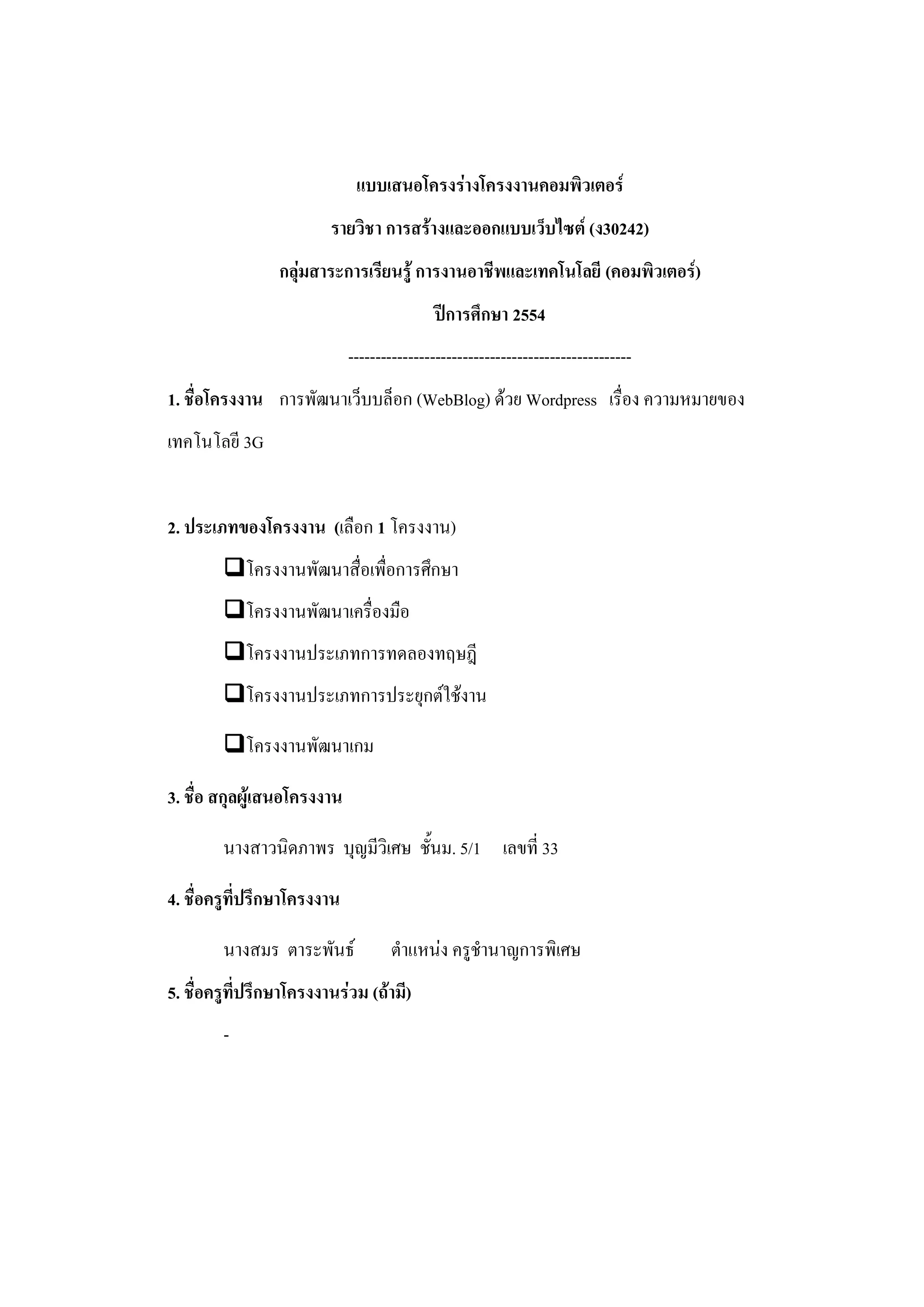รายวิชา การสร้างและออกแบบเว็บไซต์ (ง30242) กลุ่มสาระการเรียนรู้ การงานอาชีพและเทคโนโลยี (คอมพิวเตอร์) ปีการศึกษา 2554 ---------------------------------------------------- 1. ชื่อโครงงาน การพัฒนาเว็บบล็อก (WebBlog) ด้วย Wordpress เรื่อง ความหมายของ เทคโนโลยี 3G 2. ประเภทของโครงงาน (เลือก 1 โครงงาน) โครงงานพัฒนาสื่อเพื่อการศึกษา โครงงานพัฒนาเครื่องมือ โครงงานประเภทการทดลองทฤษฎี โครงงานประเภทการประยุกต์ใช้งาน โครงงานพัฒนาเกม 3. ชื่อ สกุลผู้เสนอโครงงาน นางสาวนิดภาพร บุญมีวิเศษ ชั้นม. 5/1 เลขที่ 33 4. ชื่อครูที่ปรึกษาโครงงาน นางสมร ตาระพันธ์ ตาแหน่ง ครูชานาญการพิเศษ 5. ชื่อครูที่ปรึกษาโครงงานร่วม (ถ้ามี) -