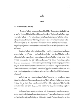 บทที่ 1 บทนา 1.1 แนวคิด ที่มา และความสาคัญ ปัจจุบนเทคโนโลยีสารสนเทศและอินเทอร์เน็ตได้เข้ามามีบทบาทต่อการดาเนินชีวิตของ ั เรามากขึ้น ซึ่งเราอาจไม่รู้สึกตัวว่าอินเทอร์เน็ตกลายเป็ นปัจจัยที่สาคัญต่อการดารงชีวิตในยุคข้อมูล ข่าวสารมีความสาคัญ คนหันมาบริ โภคข้อมูลข่าวสารกันมากขึ้น นอกจากเทคโนโลยีอินเทอร์เน็ต เปรี ยบเสมือนถนนสาหรับการเข้าไปถึงข้อมูลที่ตองการ เรายังต้องการเครื่ องมือที่จะสามารถสร้าง ้ เนื้อหาและข้อมูลต่างๆ ไว้รองรับการเข้าถึง นันก็คือเทคโนโลยีเว็บไซต์ ซึ่งเป็ นตัวกลางคอยให้ ่ ข้อมูลต่างๆ แก่ผใช้โดยการพัฒนาของเทคโนโลยีอินเทอร์เน็ตและเว็บไซต์ได้ถกเปลี่ยนแปลงจาก ู้ ู เดิมไปมาก ในยุคที่เทคโนโลยีการสื่อสารผ่านอินเทอร์เน็ต กาลังเป็ นที่นิยมและมีผลกระทบในทุกๆ ด้านในปัจจุบน ทาให้ทุกคน ทุกสังคมต้องมีการปรับตัว และพัฒนาให้ทนต่อการเปลี่ยน ั ั เปลี่ยนแปลงในโลกของการสื่อสาร และการพัฒนาของโลกเวิลด์ไวด์เว็บ (World Wide Web; WWW) จากยุคแรก คือ Web 1.0 ซึ่งมีลกษณะเป็ น Static Web คือมีการนาเสนอข้อมูลทางเดียว ั (one-way communication) ด้วยการแปลงข้อมูลข่าวสารที่มีอยูรอบตัวเราให้อยูในรู ปของดิจิตอล ่ ่ (Digital) เช่น หนังสือพิมพ์ นิตยสาร หรื อการโฆษณาตามหน้าเว็บไซต์ โดยผูใช้สามารถอ่านได้แต่ ้ ไม่สามารถเข้าร่ วมในการสร้างข้อมูลได้ แต่เมื่อก้าวเข้าสู่ยคที่ 2 ของเทคโนโลยีคือ WWW หรื อ ุ Web 2.0 เป็ นยุคที่ทาให้อินเทอร์เน็ตมีศกยภาพในการใช้งานมากขึ้น เน้นให้ผใช้มีส่วนร่ วมในการ ั ู้ สร้างสรรค์ จุดกาเนิดของ Web 2.0 และการพัฒนาก้าวผ่านเข้าสู่ยค Web 3.0 ความนิยมขอ Social ุ Media มีการเติบโตอย่างไม่หยุดยั้งและมีแนวโน้มของผูใช้บริ การทัวโลก ปัจจุบน Social Network ้ ่ ั Website ต่าง ๆ ก็มีการพัฒนา และเปิ ดโอกาสให้ผใช้ได้เข้าไปมีส่วนร่ วมในการใช้ประโยชน์เชิง ู้ สังคมกันมากขึ้น ไม่ว่าจะเป็ น Facebook หรื อ การสร้างเว็บ Blog เพื่อเผยแพร่ ขอมูลในรู ปแบบ ้ ต่างๆ ในเรื่ องของเนื้อหาความรู้เกี่ยวกับแท็บแล็ต นั้น เป็ นความสนใจส่วนตัวที่อยากจะศึกษา เรื่ องราวเกี่ยวกับ แท็บเล็ต ซึ่งเครื่ องคอมพิวเตอร์ที่สามารถใช้ในขณะเคลื่อนที่ได้ขนาดกลางและใช้ หน้าจอสัมผัสในการทางานเป็ นอันดับแรก มีคียบอร์ดเสมือนจริ งหรื อปากกาดิจิตอลในการใช้งาน ์