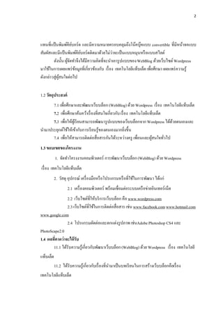 convertible ที่มีหน้าจอแบบ ์ สัมผัสและมีแป้ นพิมพ์คียบอร์ดติดมาด้วยไม่ว่าจะเป็ นแบบหมุนหรื อแบบสไลด์ ์ ดังนั้น ผูจดทาจึงได้มีความคิดที่จะนาเอารู ปแบบของ WebBlog ด้วยเว็บไซต์ Wordpress ้ั มาใช้ในการเผยแพร่ ขอมูลที่เกี่ยวข้องกับ เรื่ อง เทคโนโลยีแท็บเล็ต เพื่อศึกษา เผยแพร่ ความรู้ ้ ดังกล่าวสู่ผสนใจต่อไป ู้ 1.2 วัตถุประสงค์ 7.1 เพื่อศึกษาและพัฒนาเว็บบล็อก (WebBlog) ด้วย Wordpress เรื่ อง เทคโนโลยีแท็บเล็ต 7.2 เพื่อศึกษาค้นคว้าเรื่ องที่สนใจเกี่ยวกับ เรื่ อง เทคโนโลยีแท็บเล็ต 7.3 เพื่อให้ผเู้ รี ยนสามารถพัฒนารู ปแบบของเว็บบล็อกจาก Wordpress ได้ดวยตนเองและ ้ นามาประยุกต์ใช้ให้เข้ากับการเรี ยนรู้ของตนเองมากยิงขึ้น ่ 7.4 เพื่อให้สามารถติดต่อสื่อสารกันได้ระหว่างครู เพื่อนและผูสนใจทัวไป ้ ่ 1.3 ขอบเขตของโครงงาน 1. จัดทาโครงงานคอมพิวเตอร์ การพัฒนาเว็บบล็อก (WebBlog) ด้วย Wordpress เรื่ อง เทคโนโลยีแท็บเล็ต 2. วัสดุ อุปกรณ์ เครื่ องมือหรื อโปรแกรมหรื อที่ใช้ในการพัฒนา ได้แก่ 2.1 เครื่ องคอมพิวเตอร์ พร้อมเชื่อมต่อระบบเครื อข่ายอินเทอร์เน็ต 2.2 เว็บไซต์ที่ให้บริ การเว็บบล็อก คือ www.wordpress.com 2.3 เว็บไซต์ที่ใช้ในการติดต่อสื่อสาร เช่น www.facebook.com www.hotmail.com www.google.com 2.4 โปรแกรมตัดต่อและตกแต่งรู ปภาพ เช่นAdobe Photoshop CS4 และ PhotoScape2.0 1.4 ผลที่คาดว่าจะได้ รับ 11.1 ได้รับความรู้เกี่ยวกับพัฒนาเว็บบล็อก (WebBlog) ด้วย Wordpress เรื่ อง เทคโนโลยี แท็บเล็ต 11.2 ได้รับความรู้เกี่ยวกับเรื่ องที่นามาเป็ นบทเรี ยนในการสร้างเว็บบล็อกคือเรื่ อง เทคโนโลยีแท็บเล็ต