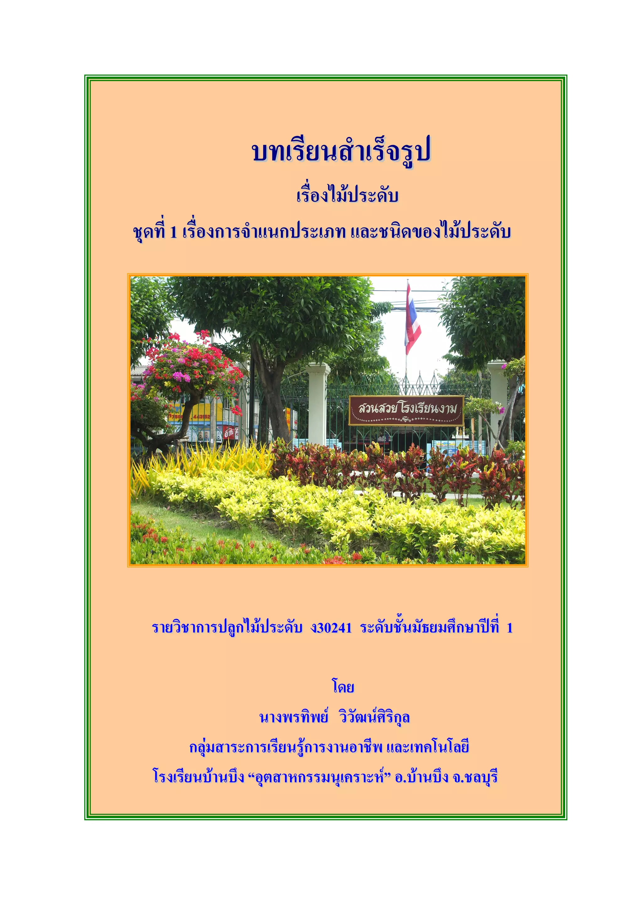 กรอบที่ 1 หนูๆ ทราบไหมคะวา การจําแนกประเภท และชนิดของไมประดับ เปนเรื่อง สําคัญมาก นักเรียนมือใหมมักจะมีปญหา เพราะนักเรียนไมรูจักพันธุไม จึงไมสามารถจําแนกประเภท ของไมประดับได นักเรียนตองศึกษาลักษณะของ พันธุไมใหเขาใจไปพรอมกันกับการฝกการจําแนกประเภทของไมประดับ เอาละคะ สนใจแลวใชไหม ตามมาเลยคะ ไมประดับ คือ ไมที่นิยมใชปลูกประดับเพื่อตกแตงสถานที่ อาคาร บานเรือน สวนสาธารณะเพื่อความสวยงาม ประเภทของไมประดับ สามารถจําแนกออกไดดังนี้ 1.จําแนกตามความมุงหมายที่ใช 2.จําแนกตามประเภทของเนื้อไม 3.จําแนกตามลักษณะการเจริญเติบโต . ]ydKItdkig0ibPg9b[F9 4.จําแนกตามอายุพันธุไม 5.จําแนกตามความเปนอยู 1. การจําแนกไมประดับตามความมุงหมายที่ใช หมายถึง การจําแนกพันธุไม โดยคํานึงถึงการใชประโยชนจาก พันธุไมนั้น วาจะนํามาใชเพื่อประโยชนอะไร และใชสวนไหนของพันธุไม เพื่อใหไดประโยชนตามที่ตองการ ซึ่งการจําแนกดังกลาว อาจแบง ไมประดับตามความมุงหมายที่ใช ออกเปน 4 ประเภท คือ 1.ไมใบ 2.ไมกระถาง 3. ไมดัด 4. ไมแคระ ดูเฉลยหนา 12 กรอบคําถามที่ 1 การใชประโยชนจากพันธุไมเพื่อการประดับตกแตง คือการจําแนกประเภท ของไมประดับแบบใด ก.ตามความมุงหมายที่ใช ข.ตามประเภทของเนื้อไม ค.ตามลักษณะการเจริญเติบโต ง.ตามอายุพันธุไม 6 52
