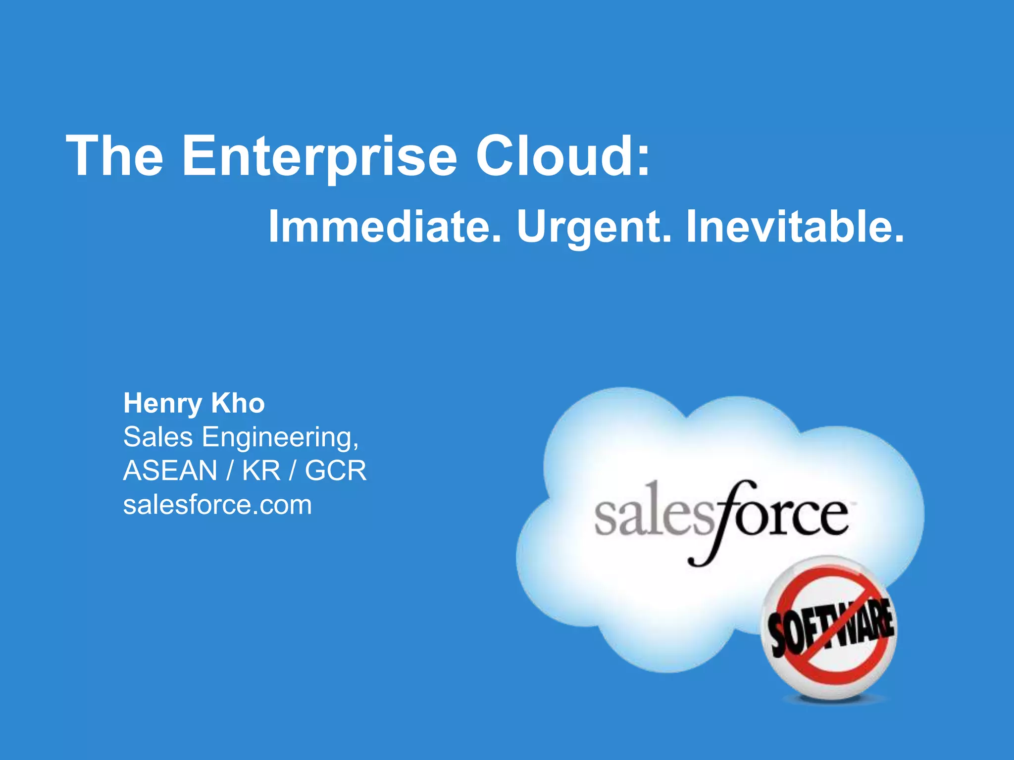 The document discusses Salesforce.com's enterprise cloud offerings, emphasizing the importance of cloud computing in addressing significant IT debt and operational challenges. It presents the advantages of the Force.com platform, highlighting cost savings, speed of development, and potential risks associated with forward-looking statements. The content also references industry reports that underscore the transition from traditional platforms to cloud solutions.