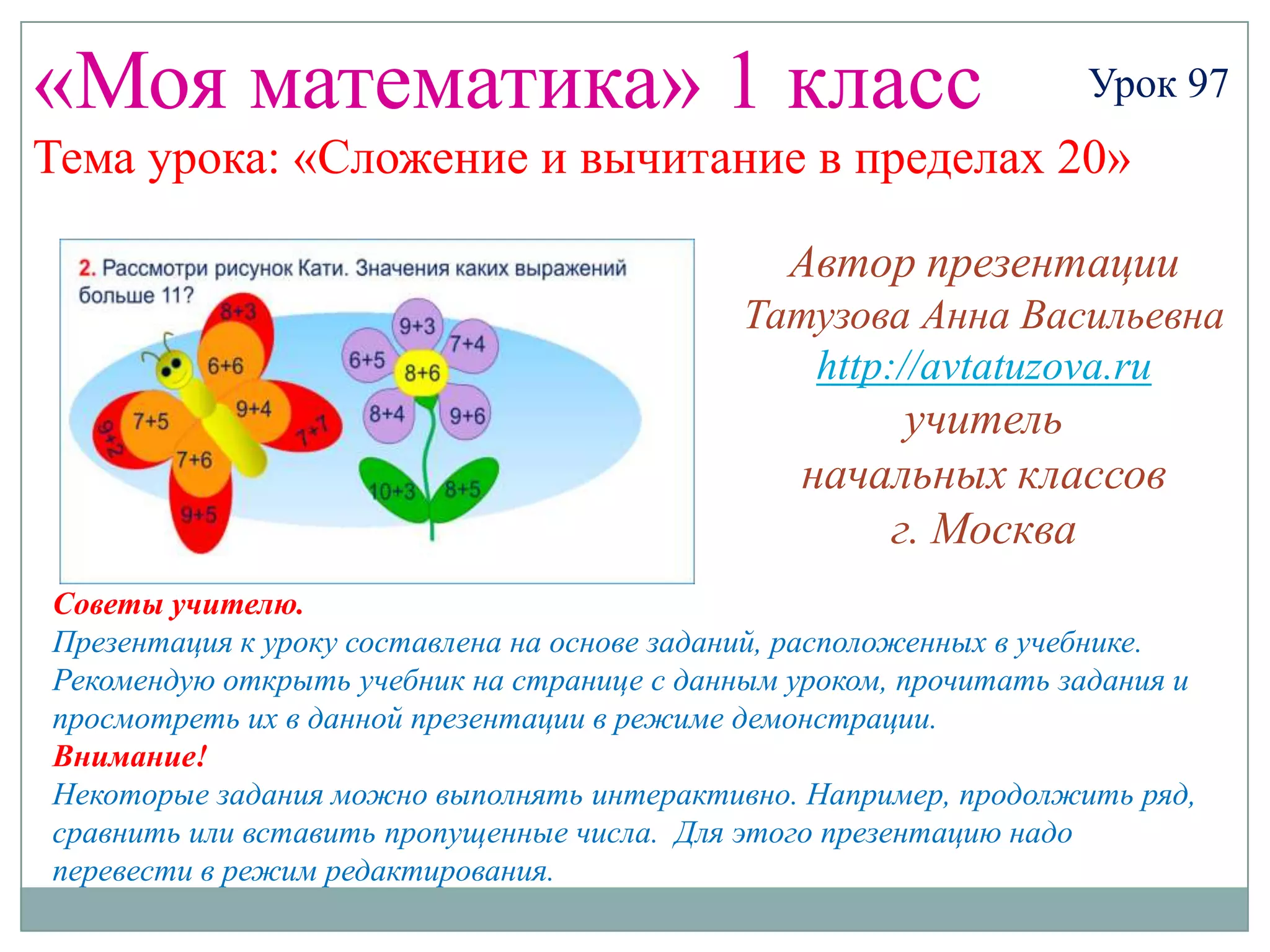 Документ представляет собой презентацию для 1 класса по теме 'сложение и вычитание в пределах 20'. Она содержит задания для учеников, включая интерактивные элементы, и рекомендации для учителей. Основная цель урока — помочь детям освоить базовые математические операции на примерах и задачах.
