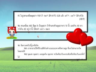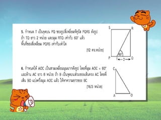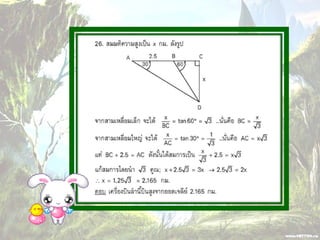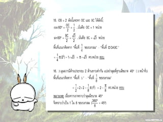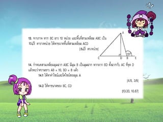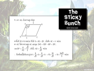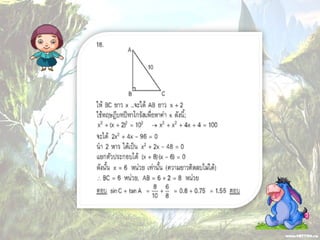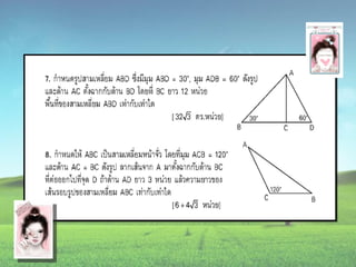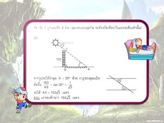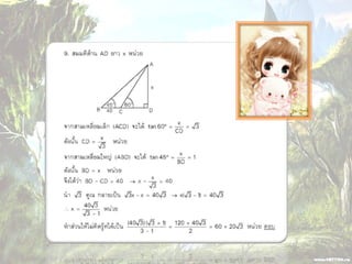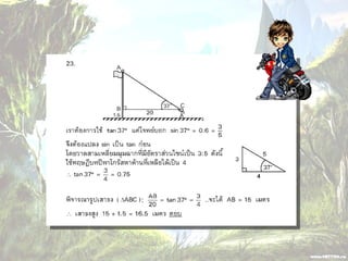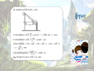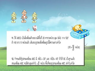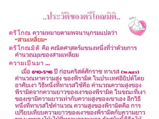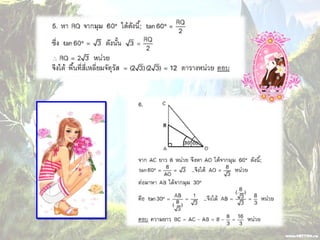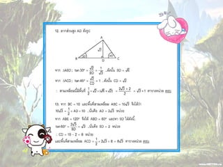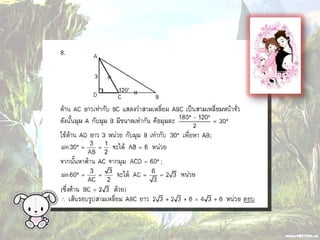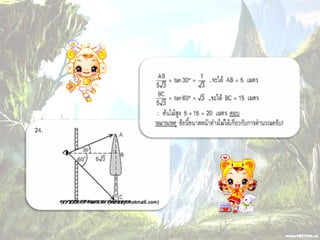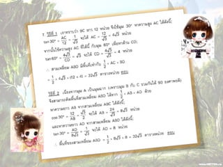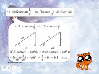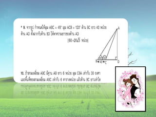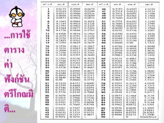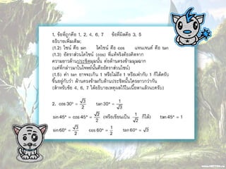 1. 0 <sin A < 1 และ cosec A > 1 2. 0 < cos A < 1 และ sec A > 1 3. sin ( A + B ) = sin A + sin B 4. ( sin A )( sin A ) = (sin A) 2 = sin 2A ¹ sin A 2 5. sin A = cos ( 90 – A ) 6. cos A = sin ( 90 – A ) 7. tan A = cot ( 90 – A ) 8. sec A = cosec ( 90 – A )