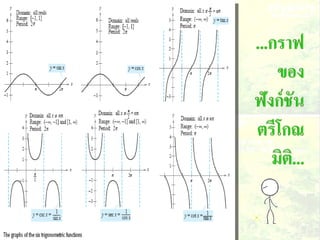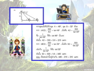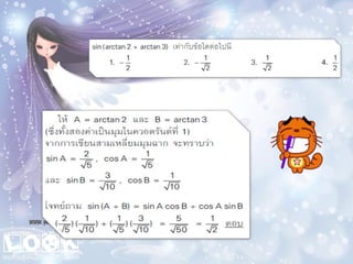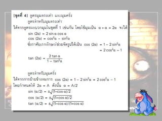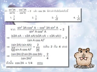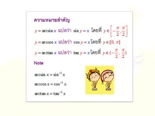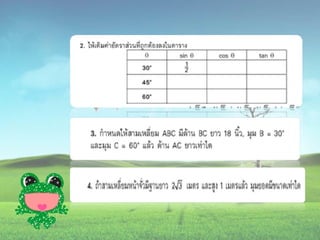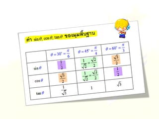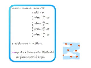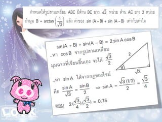 1. 0< sin A < 1 และ cosec A > 1 2. 0 < cos A < 1 และ sec A > 1 3 . sin ( A + B ) sin A + sin B ( sin A )( sin A ) = (sin A) 2 = sin 2 A sin A 2 5. sin A = cos ( 90 – A ) 6. cos A = sin ( 90 – A ) 7. tan A = cot ( 90 – A ) 8. sec A = cosec ( 90 – Am)