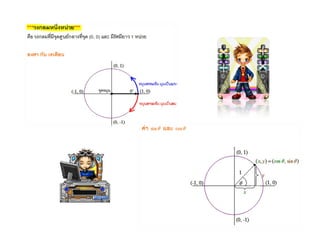 จากรูป เราจะวัดมุมในหน่วยเรเดียน โดยให้มุมเป็นบวกในทิศทวนเข็มนาฬิกาและมุมเป็นลบในทิศตามเข็มนาฬิกา ลากเส้นให้ทำมุม θ กับแกน x ด้านบวก และตัดกับวงกลมหนึ่งหน่วย จะได้ว่าพิกัด x และ y ของจุดตัดนี้ จะเท่ากับ cos θ และ sin θ ตามลำดับ เหตุผลเพราะว่ารูปสามเหลี่ยมที่เกิดขึ้นนั้น จะมีความยาวด้านตรงข้ามมุมฉาก ยาวเท่ากับรัศมีวงกลม นั่นคือยาวเท่ากับ 1 หน่วย เราจะได้ sin θ = y /1 และ cos θ = x /1 วงกลมหนึ่งหน่วยช่วยให้เราหากรณีที่สามเหลี่ยมมีความสูงเป็นอนันต์ ( เช่น มุม π/2 เรเดียน ) โดยการเปลี่ยนความยาวของด้านประกอบมุมฉาก แต่ด้านตรงข้ามมุมฉากยังยาวเท่ากับ 1 หน่วย เท่าเดิม