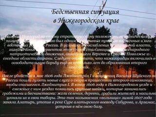 Нижний Новгород играл ключевую роль в патриотическом движении России во времена смуты, сильнее всего проявив себя под руководством Кузьмы Минина и князя Дмитрия Пожарского. В условиях ослабления центральной власти и нашествия иностранных интервентов город стал центром формирования второго народного ополчения, что способствовало национально-освободительной борьбе. Итогом усилий нижегородцев стало освобождение Москвы от польско-литовских сил и укрепление единства русского народа.