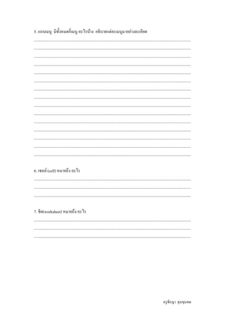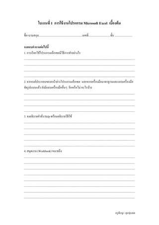 The document contains questions about basic Microsoft Excel functions including: how to open the Excel program; other toolbars besides the standard and formatting toolbars; an explanation of the Help function and how to use it; what a workbook refers to; details about the menu bar including the total number of menus and descriptions of each; and definitions of a cell and worksheet. The student is asked to answer each question in the provided lines.