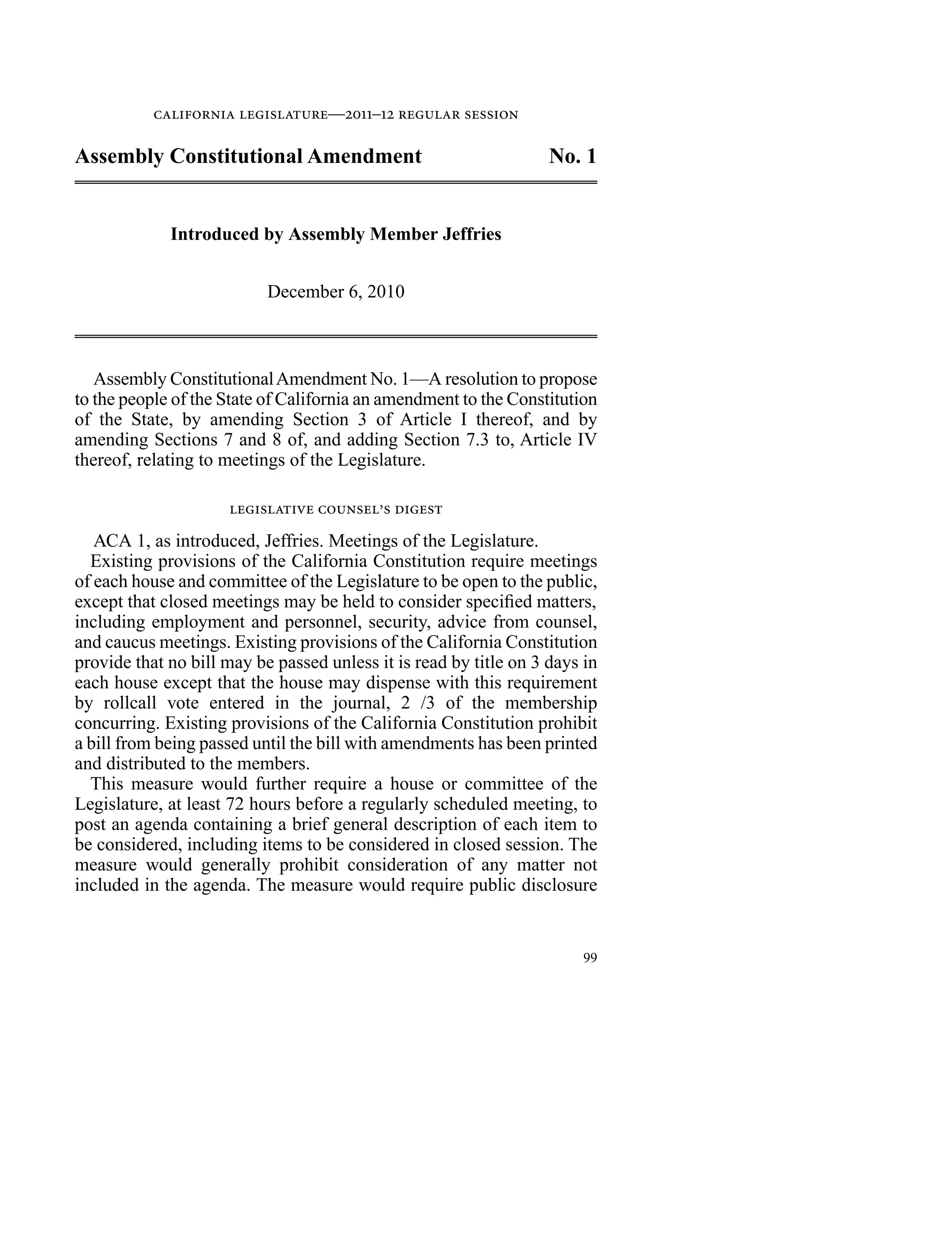 This document is an Assembly Constitutional Amendment introduced in the California legislature that proposes several amendments to the state constitution regarding meetings of the legislature. Specifically, it requires 72 hours advance notice of meeting agendas, public disclosure of documents provided to members regarding agenda items, and opportunities for public comment at committee meetings. It also requires bills to be printed and distributed to members 24 hours before a vote. If approved by the legislature and voters, these changes would amend sections of the state constitution dealing with public access to government meetings and legislative procedures.