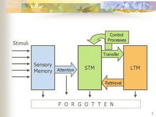 The Atkinson-Shiffrin Model proposes that human memory consists of three stores: sensory memory, short-term memory, and long-term memory. Sensory memory briefly stores sensory information through iconic, echoic, and haptic memory. Short-term memory then stores about 7 chunks of information that can be rehearsed for around 18-20 seconds. Long-term memory permanently stores meaningful information through elaborative rehearsal and associations with existing knowledge.