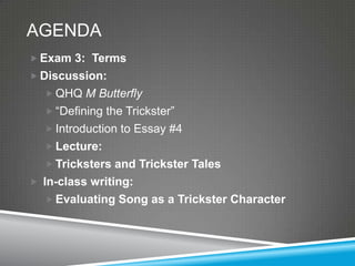The document provides an agenda for an English class that includes discussing the play M. Butterfly and evaluating the character Song as a trickster. It introduces an upcoming essay assignment on the research essay about trickster tales and characters. Students will consider if trickster tales help people better understand themselves and subconscious responses, or if they serve another purpose. Examples of possible trickster traits are defined, including being deceitful, a shape-shifter, bringing unexpected change, and serving as a teacher.