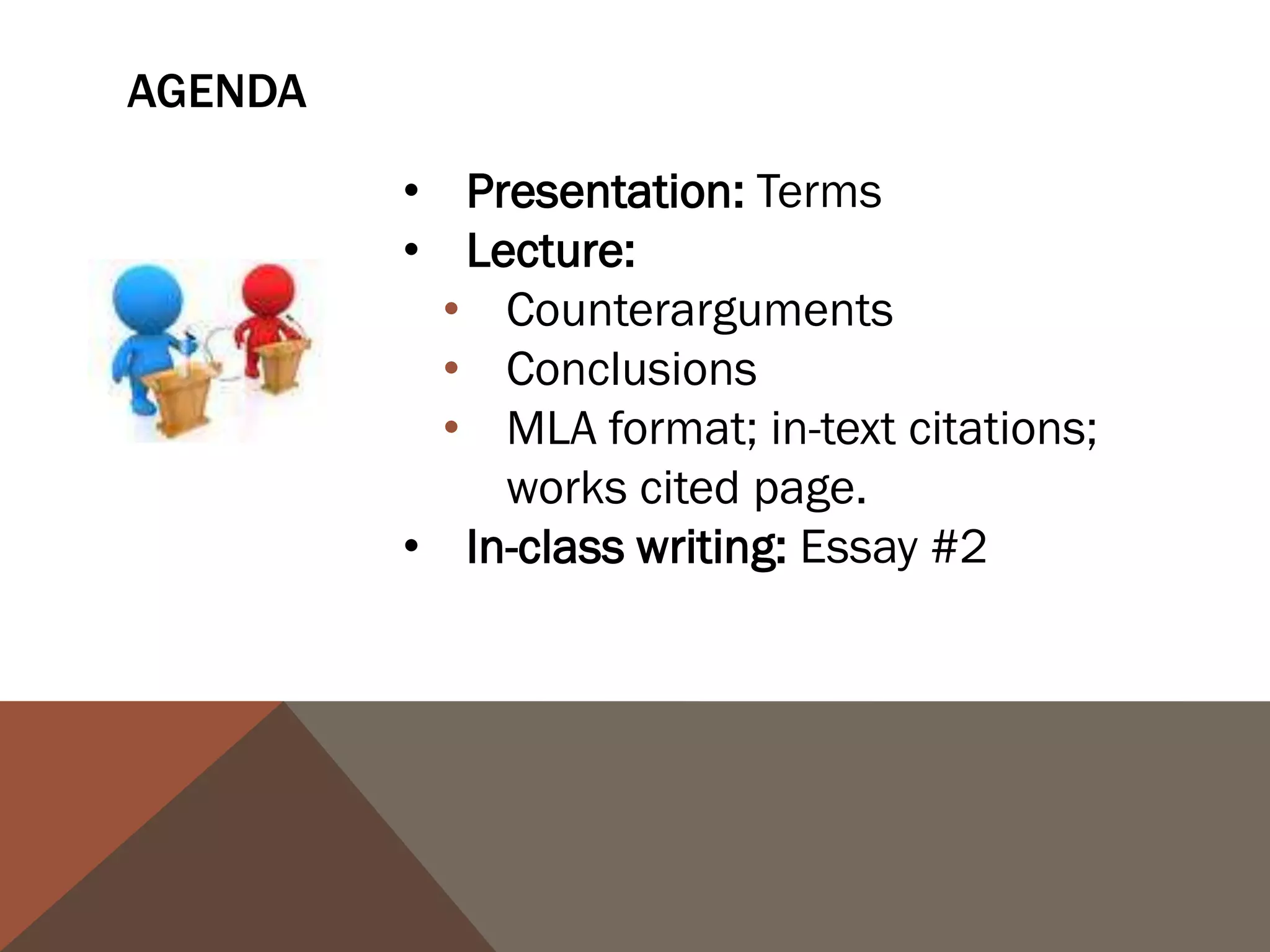 This document contains an agenda and terms for a lecture on counterarguments, conclusions, and MLA citation format. The agenda includes a presentation on terms, a lecture covering counterarguments and conclusions, and an in-class writing assignment. Definitions are provided for terms related to economic class, ethnocentrism, gender, gender expression, inclusiveness, internalized oppression, queer, resistance, and sexism. An outline is given for the in-class writing assignment, providing strategies for introducing a thesis, writing body paragraphs with supporting evidence, anticipating counterarguments, and concluding the essay.