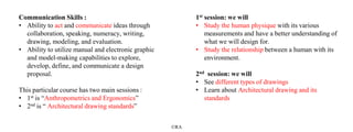 The document outlines a course focused on communication skills in design, emphasizing anthropometrics and ergonomics across two main sessions. It covers essential terminologies, the study of human body measurements, and their applications in architectural design to ensure comfort and efficiency in spaces. The content also includes basic principles like proportion and scale, crucial for creating ergonomic and functional environments.