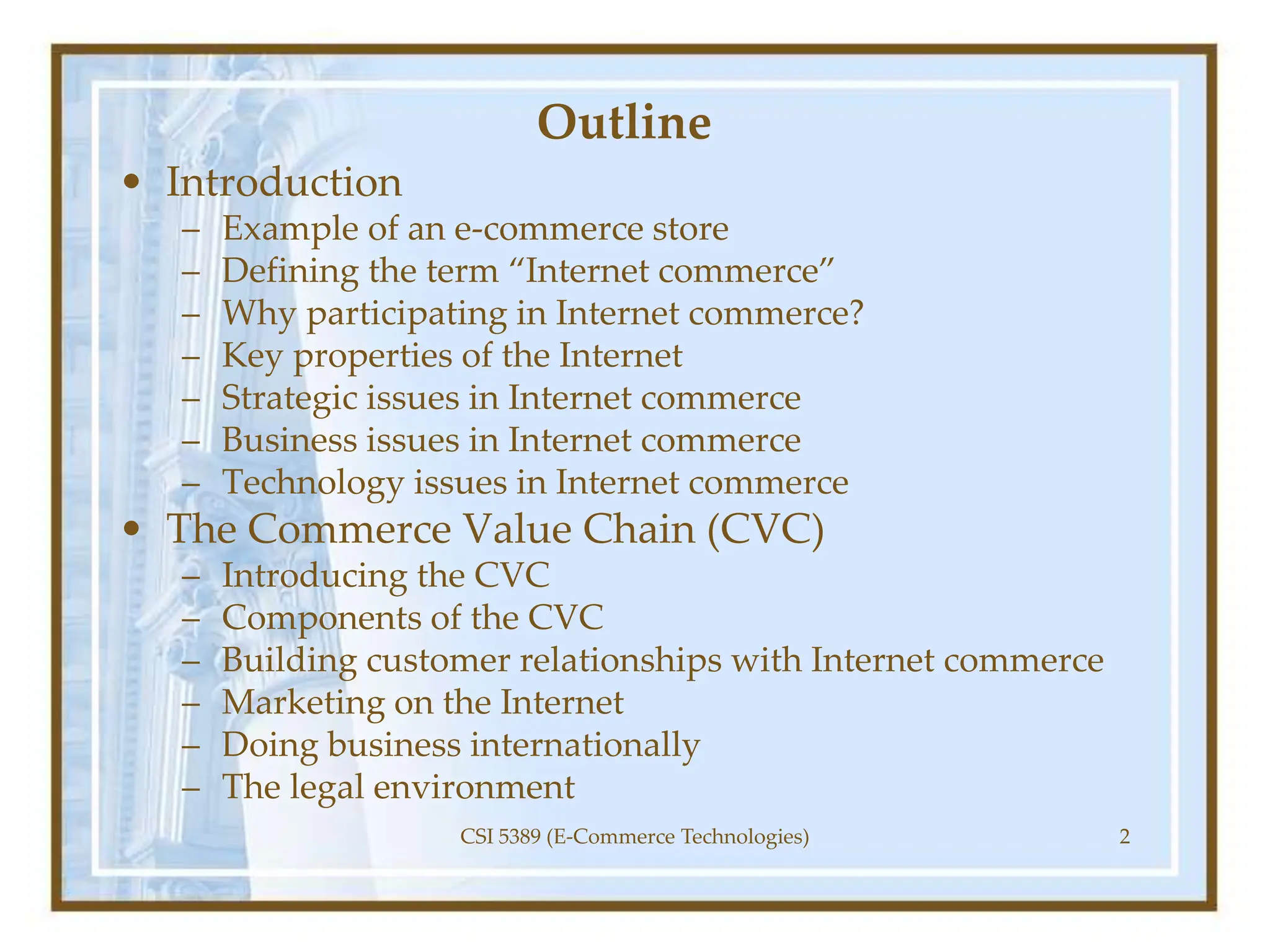 This document provides an overview of basic e-commerce concepts, including defining internet commerce, reasons for participating in internet commerce, key properties of the internet, and strategic, business, and technology issues related to internet commerce. It introduces the Commerce Value Chain (CVC) model and describes its components, including attracting customers, interacting with customers, acting on customer instructions, and reacting to customer requests.