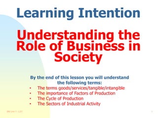 This document provides an overview of key concepts for Unit 1, Learning Outcome 1 of a Business Management course. It defines important business terms like goods, services, and the factors of production. It also describes the role of businesses in society, different business organizations and objectives, and the entrepreneur. Finally, it outlines the sectors of industrial activity and the cycle of business.