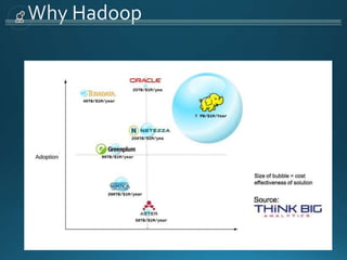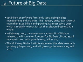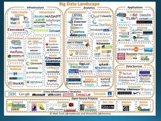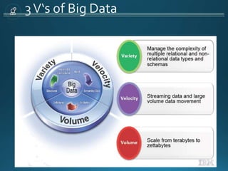 This document provides an introduction to big data, including definitions and key concepts. It discusses the volume, velocity, and variety of big data sources and challenges in storage and processing large amounts of data from many different sources. Examples of big data applications are given in several domains like healthcare, retail, and social media. Distributed systems and architectures like Hadoop and MapReduce are introduced as approaches to analyze huge volumes of data across multiple servers and storage areas. Challenges in distributed systems and how big data is driving new technologies are also summarized.