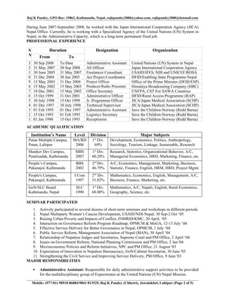 This document is a curriculum vitae for Raj K Pandey that includes his personal and contact information, career summary, professional experience, academic qualifications, seminars participated in, and major responsibilities. It details his extensive experience working for organizations such as the United Nations, Japan International Cooperation Agency, UK Department for International Development, and Save the Children, as well as his education including a Masters in Business Studies and MA in Rural Development. The CV provides a comprehensive overview of Raj K Pandey's qualifications and experience in administrative and project coordination roles.