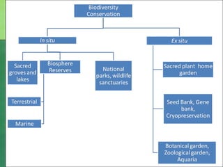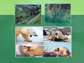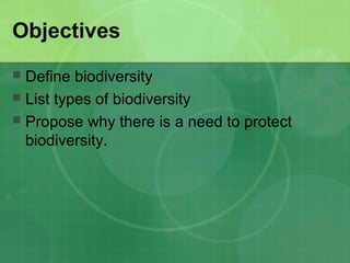 The document defines biodiversity as the variety of life on Earth, including genetic, population, species, and ecosystem diversity. It then lists the three main types of biodiversity as genetic, species, and ecosystem diversity. Finally, it proposes that biodiversity needs to be protected for moral, economic, and ecological reasons, including maintaining ecosystem health and services.