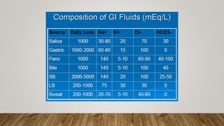 - Body fluids facilitate transport of nutrients, waste removal, and cellular metabolism. Total body water is 60% of weight, with two-thirds being intracellular fluid and one-third extracellular fluid.