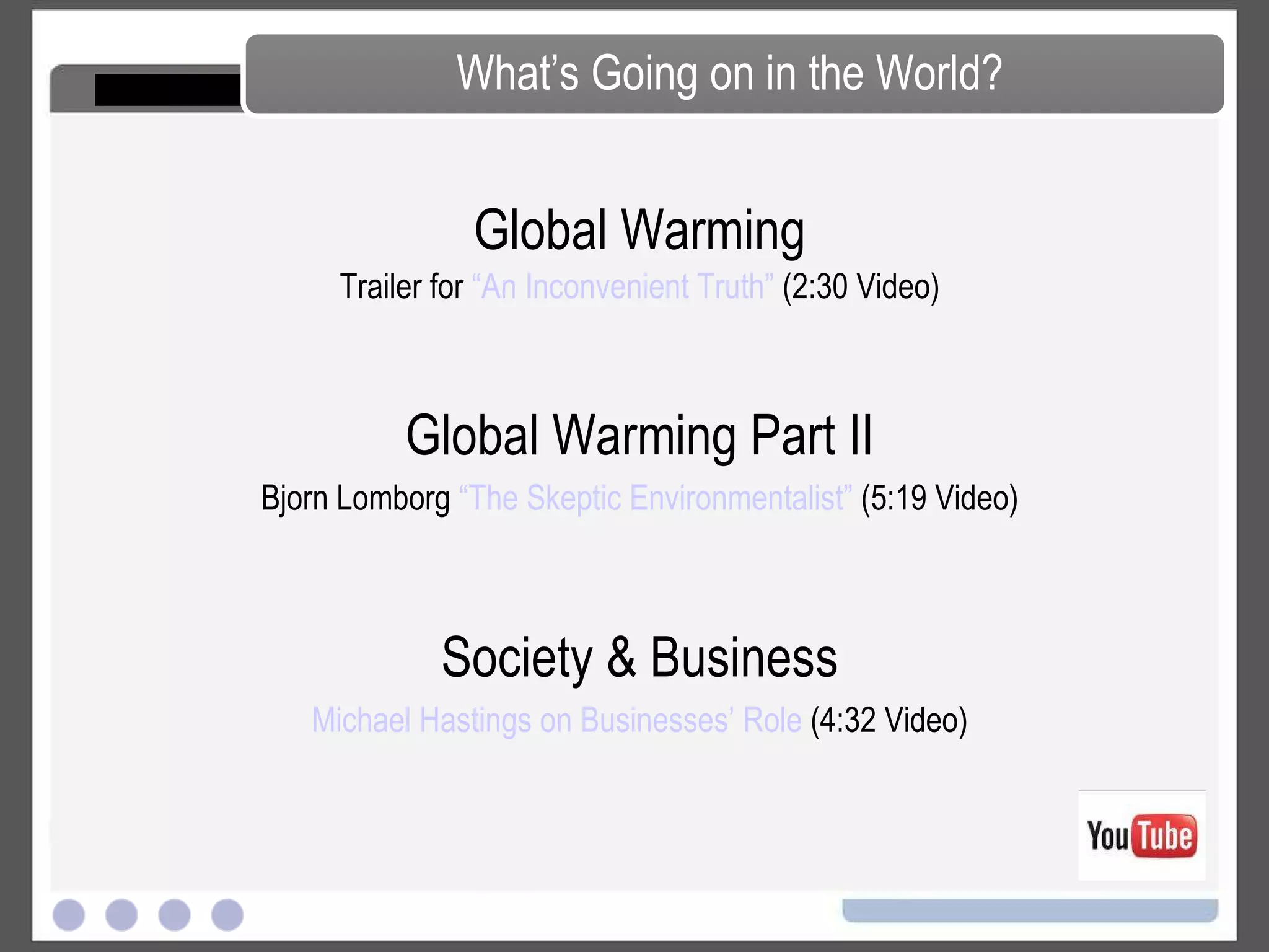- An introduction to the topics of global warming, skepticism about climate change, and businesses' role in society through video clips.