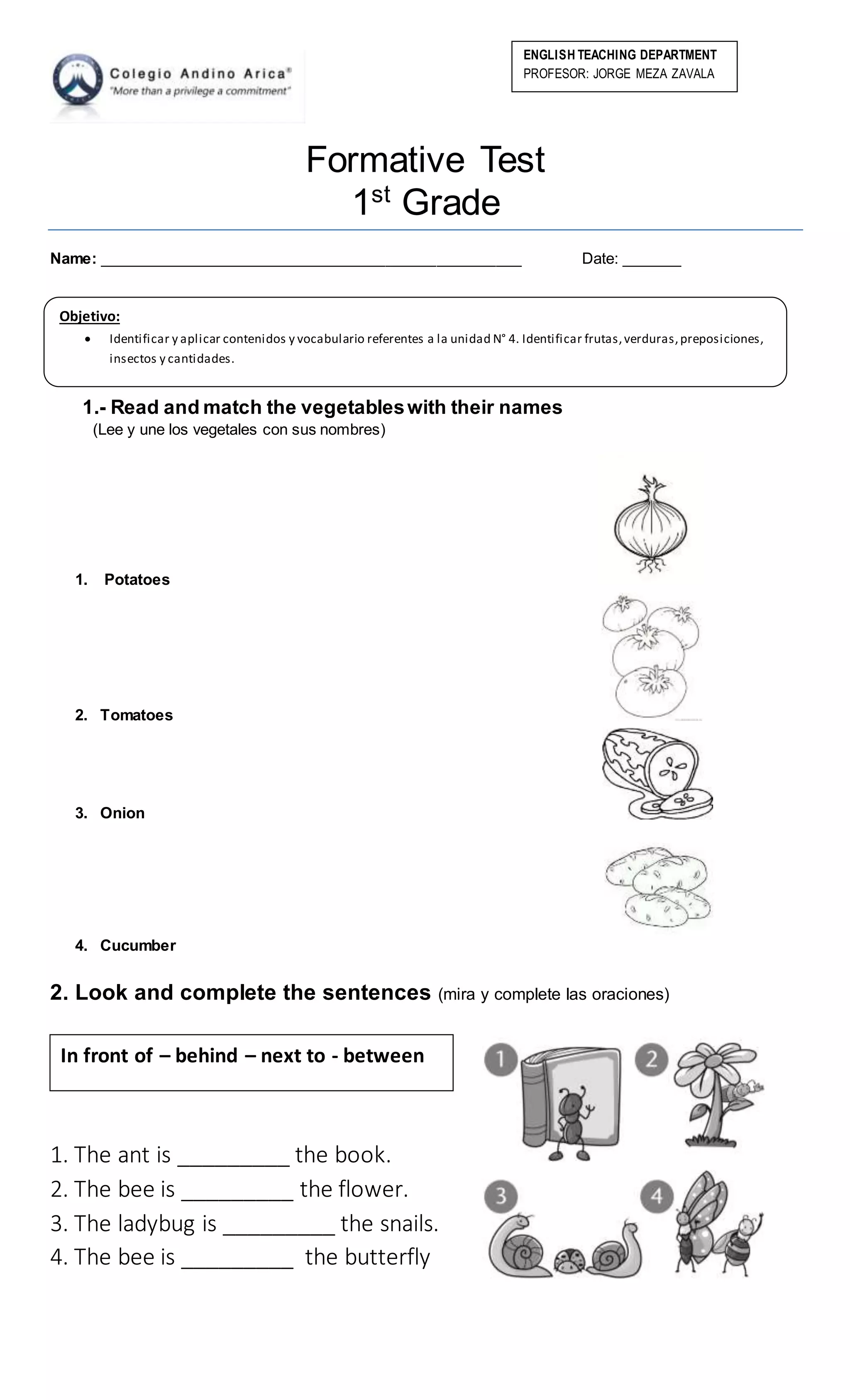 This formative test for 1st grade students contains questions to assess their knowledge of vegetables, fruits, insects, and prepositions. The test includes matching vegetables to their names, completing sentences using prepositions like "in front of" and "behind", counting and coloring different items, and identifying singular and plural forms of fruits. The objective is to identify and apply vocabulary and content related to unit 4, which covers identifying fruits, vegetables, insects, and amounts.