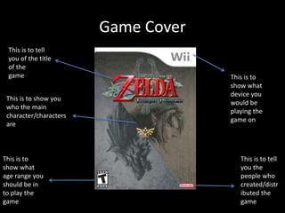 The Legend of Zelda: Twilight Princess is an action-adventure game released in 2006 for the Nintendo GameCube and Wii. The main character is Link, who can transform into a wolf. The game's terrain includes village environments and fantasy elements like magic items. Characters wear exaggerated, non-realistic clothing from nature. The game was delayed to be remade for the Wii console and uses cel-shading graphics with a third-person perspective. Cutscenes advance the story, and the player must complete quests and battles to rescue the Twilight Princess Zelda.