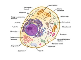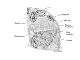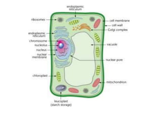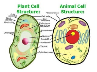This document provides information on cell structure and organization. It describes typical animal and plant cell structures as seen under light and electron microscopes. Key structures discussed include the nucleus, endoplasmic reticulum, Golgi apparatus, mitochondria, chloroplasts, cell wall, and vacuoles. It also covers tissues, organs, organ systems, and the differences between prokaryotic and eukaryotic cells.