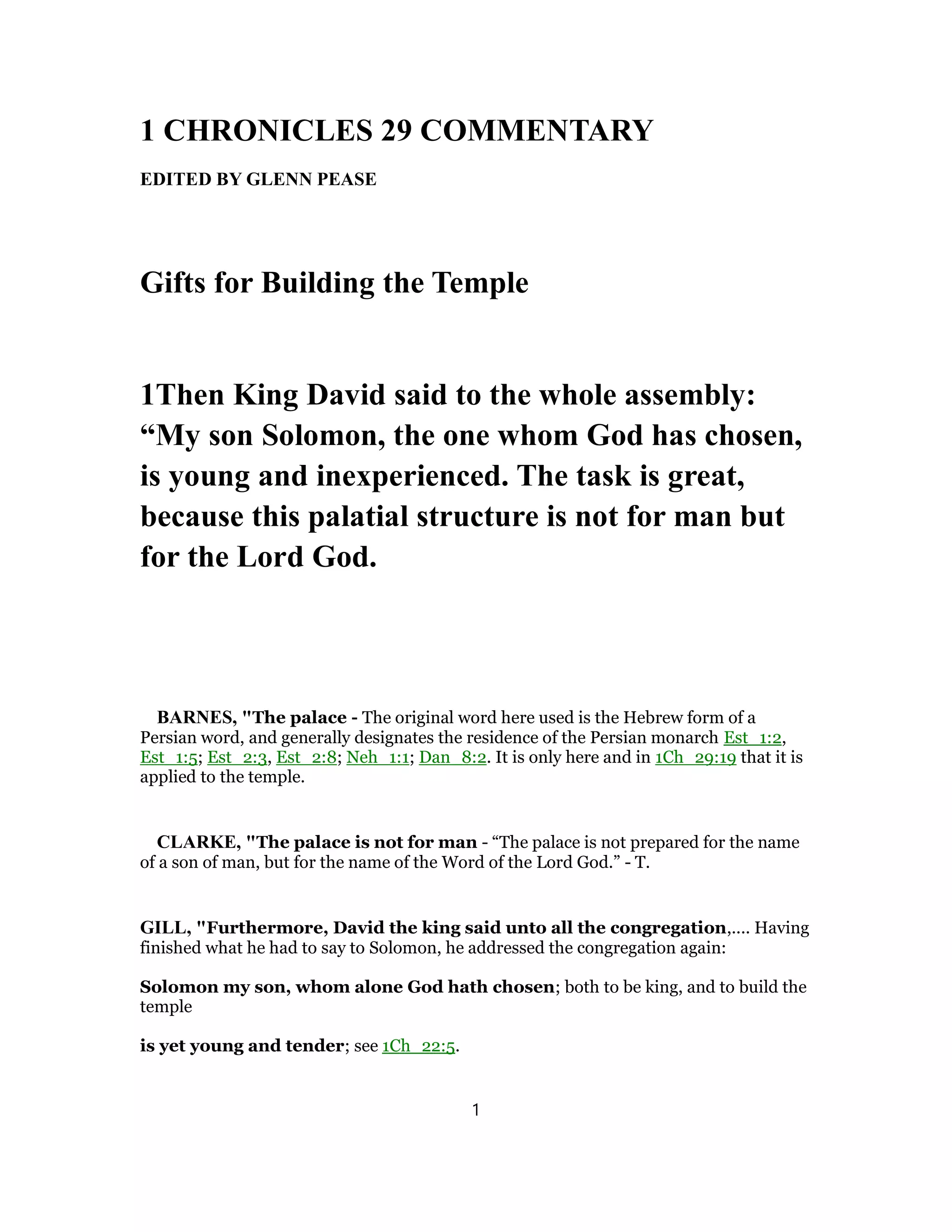 King David addresses the assembly to encourage contributions for the construction of the temple, emphasizing that it is a significant task for the young Solomon, chosen by God. He highlights the need for support, showcases his own generous gifts, and calls for voluntary offerings from the people to honor the Lord. The palace is characterized as not for man but for God, underscoring the importance of building a magnificent place of worship.