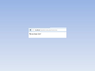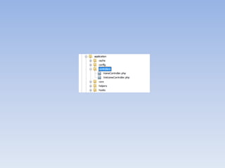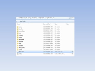 This document provides instructions for installing and configuring the CodeIgniter PHP framework. It describes downloading CodeIgniter, creating controllers and views to route requests and display content, and configuring routes to map URLs to controllers and views. It also explains how to remove "index.php" from URLs using an .htaccess file for cleaner URLs.