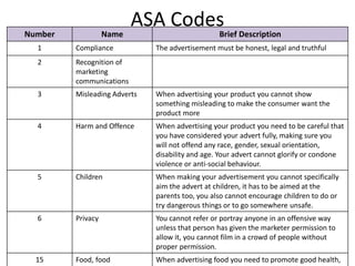 The document provides an overview of the ASA Codes for advertising communications. There are 6 codes described that cover key areas like compliance, misleading ads, harm and offense, children, privacy, and food advertising. The codes aim to ensure ads are honest, legal, consider potential harm or offense, don't mislead consumers, and don't target children directly.