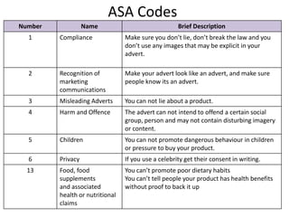 The document provides a summary of the Advertising Standards Authority (ASA) codes for advertising in the UK. It lists 13 codes and provides a brief description of each code. The codes cover areas like compliance with laws, identifying advertising as advertising, avoiding misleading claims, preventing offense or harm, restrictions around children, privacy issues, and health claims related to food and supplements.