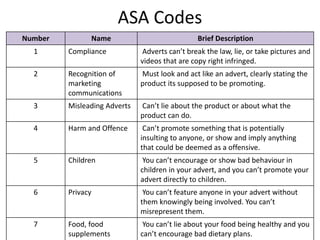 The document provides a summary of 7 ASA advertising codes related to compliance, recognition as an advert, misleading claims, harm and offence, targeting of children, privacy, and claims about food and supplements. The codes state that ads cannot break laws, lie about products, be potentially offensive, encourage bad behavior in children, misrepresent people, or lie about health claims of food.