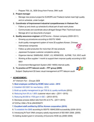 Ta Van Chuan is a quality management professional seeking a management consultant position. He has over 10 years of experience in quality assurance roles, including establishing quality management systems for several companies to meet ISO standards. He holds an MBA and bachelor's degree in quality management and has received several certifications in quality auditing, management skills, and quality tools. His strengths include a positive attitude, strong communication skills, and expertise in quality management systems.