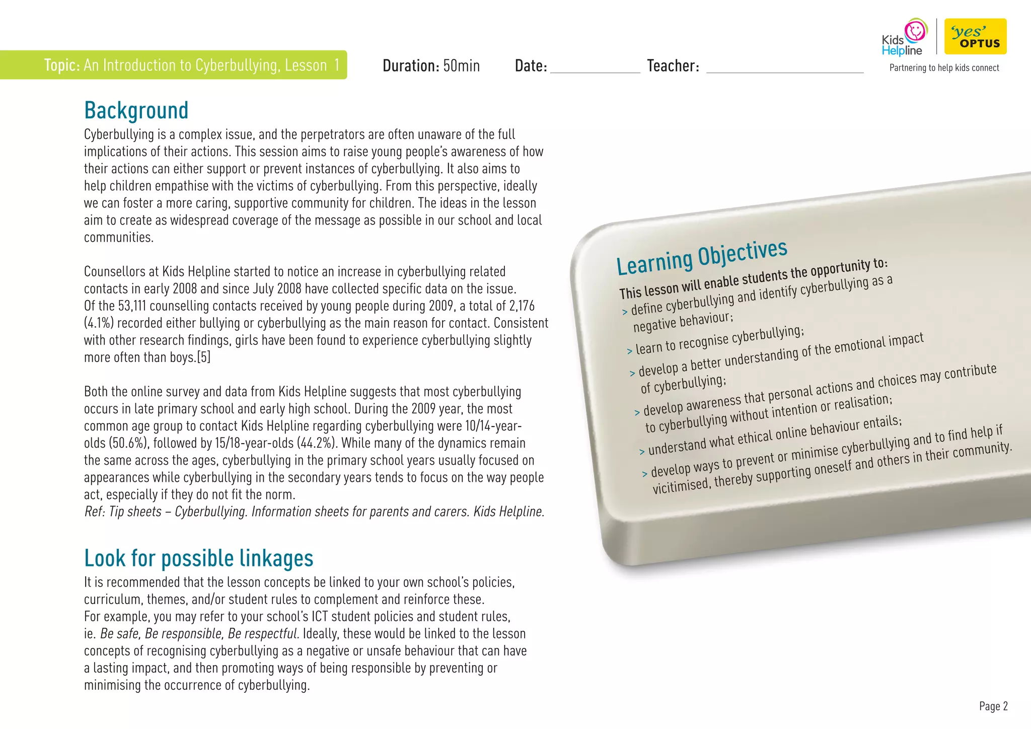 This lesson plan aims to raise awareness of cyberbullying among young people. It discusses how cyberbullying has increased based on data from Kids Helpline, with the most common age groups being 10-14 and 15-18 year olds. The lesson introduces cyberbullying and different roles in cyberbullying situations. It includes a video about cyberbullying and discusses the emotional impact it can have on victims. Students are asked to develop a code of behavior for preventing cyberbullying and supporting others in the community.