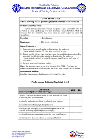 The document outlines a data gathering instrument for trainee characteristics at the Provincial Training Center in La Union, Philippines, requiring personal details, educational background, health information, learning styles, and prior experience related to computer system servicing. It includes a survey designed to assess learning styles based on the VAKAT model (Visual, Auditory, Kinesthetic, Activist, Theorist) and features sections for self-assessment with specified grading criteria. Trainees are prompted to provide various demographic and educational data to tailor the training to their individual profiles.
