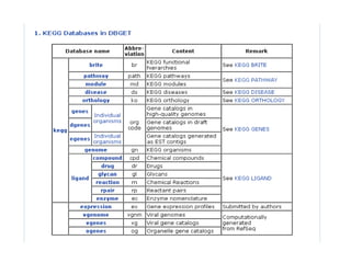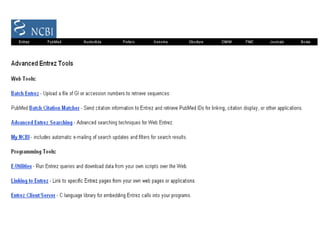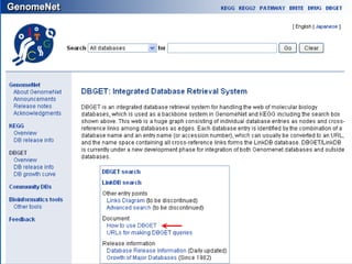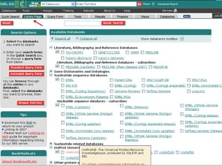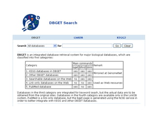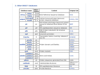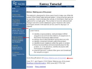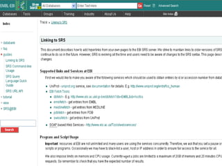 The document discusses different text-based database retrieval systems for accessing biological data, including Entrez, SRS, and DBGET/LinkDB. It describes their key features and how each system allows users to search text databases using queries, with Entrez providing linked related data across multiple databases. An example shows how each system can be used to retrieve and view related information for a SwissProt protein entry.