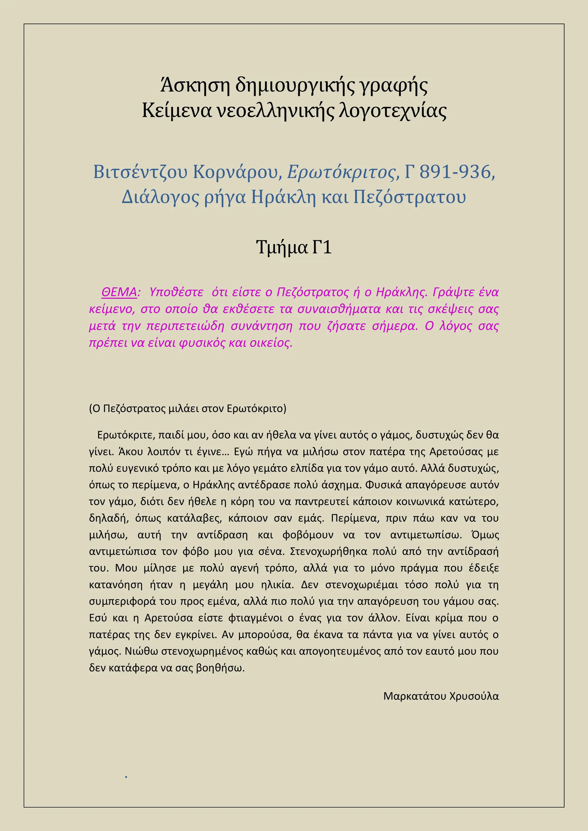 ΘΕΜΑ: Υποθέστε ότι είστε ο Πεζόστρατος ή ο Ηράκλης. Γράψτε ένα